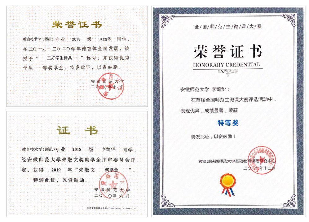 坚持学以致用,竞赛成果显著。李绮华同学在校期间多次代表我校参加各类专业比赛和创新活动,曾荣获2019年首届师范生微课大赛特等奖、2020年“iTeach”全国大学生数字化教育应用创新大赛二等奖、第14届中国大学生计算机设计大赛国家级三等奖等校级以上奖项十余项,主持省级大学生创新训练项目一项;2021年7月,入选分别由北京师范大学、华中师范大学、上海外国语大学举办的全国优秀大学生夏令营活动,与外校优秀学子研学交流、合作项目,并获得华中师范大学夏令营“优秀营员”称号。