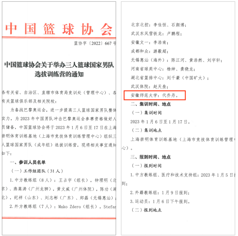 近日,为备战巴黎奥运会,经过严格试训,中国篮球协会公布了三人篮球国家男队训练营名单,我校体育学院2019级运动训练专业代乔丹同学成功入选,成为本次选拔训练营全国仅有的两位高校学生球员之一。