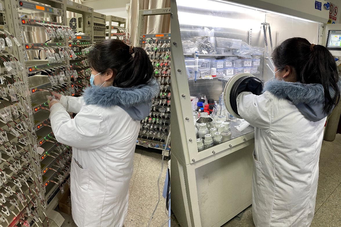 疫情的三年,她积极配合疫情防控工作,积极参加学院疫情防控志愿工作。研一期间,她勤勤恳恳学习专业课程,不断丰富自己的理论基础,不断提高自身科研能力以及电池方向专业水平,并且主动学习各种测试分析仪器使用方式以及规范作图方法。她吃苦耐劳、慎思笃行,为探索实验方案的可行性,且在科研上她具有计划性,合理安排自己的时间,不论严寒酷暑,每天坚持在实验室测试分析,直至实验室关门,研究生在读期间组装电池共计八百多块(图二)。2022年7月份,她做完根尖囊肿手术不到一周,便主动回到实验室继续完成论文。2023年1月份疫情封控,新冠感染在家中隔离期间,她仍然钻研科研论文撰写。她的付出像极了古语描述的“故天将降大任于斯人也,必先苦其心志,劳其筋骨,饿其体肤,空乏其身,行拂乱其所为,所以动心忍性,曾益其所不能。”