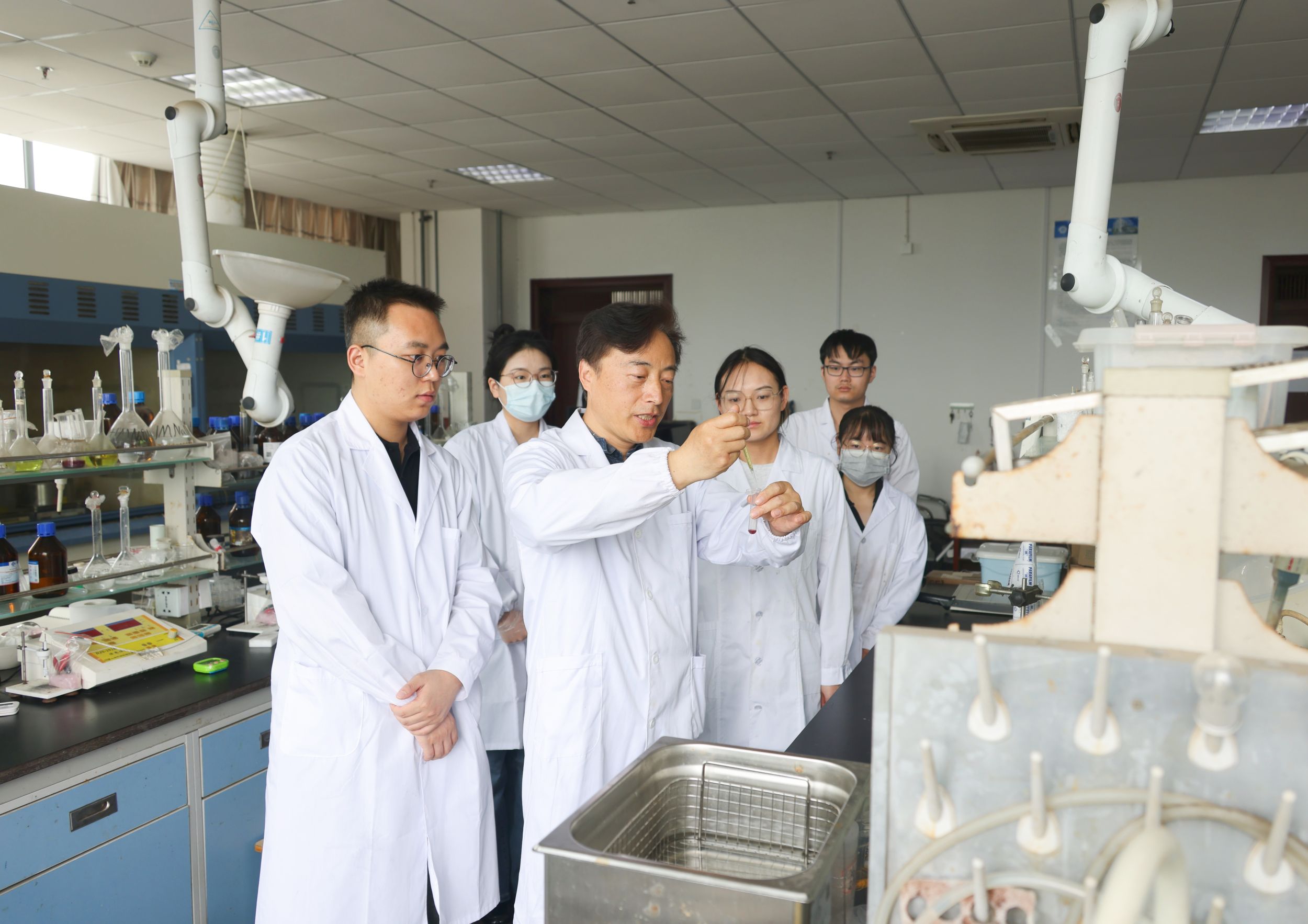 目前,倪永红担任无机化学硕士点负责人,积极开展学术交流活动,并主动为年轻教师的成长提供帮助。“我就是这样成长起来的,对于年轻人的‘传帮带’是我的分内之事。”此外,他还积极参与化学国家级实验教学示范中心、“功能分子固体”教育部重点实验室等平台的申报和建设;担任学院大型仪器中心首任主任,为学院科研发展做好服务。“自然科学的研究离不开先进仪器。在精密仪器的支撑下,我们才能搞清楚研究对象的构效关系。”倪永红如是说。2004年,化学与材料科学学院正处于起步阶段,各类实验器材都不是很完备。“当时学院的条件很艰苦,院长经常对大家说:‘勒紧裤腰带,我们每年增加一台仪器。’”为此,刚刚入职师大的倪永红每两周都会带领学生,前往南京、合肥等多地进行样品表征与性能测试。”如今我们师大发展越来越好,现在的实验设备已经处于较为先进的水平。”倪永红欣慰地说。坚守一线教学二十载,致力于学科建设发展,倪永红牢牢接过师大前辈手中的接力棒,正在努力传好下一棒。